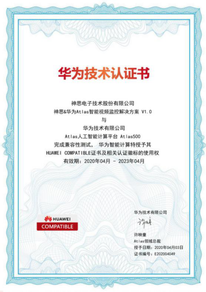 4月3日,神思電子智能視頻監(jiān)控方案順利完成華為技術(shù)有限公司Atlas人工智能計(jì)算平臺(tái)Atlas500兼容性測(cè)試,獲得了HUAWEI COMPATIBLE證書(shū)及相關(guān)認(rèn)證徽標(biāo)的使用權(quán),標(biāo)志著神思電子正式加入華為昇騰生態(tài),未來(lái)雙方將共同進(jìn)行智能視頻監(jiān)控解決方案的推廣,為行業(yè)客戶提供技術(shù)保證。